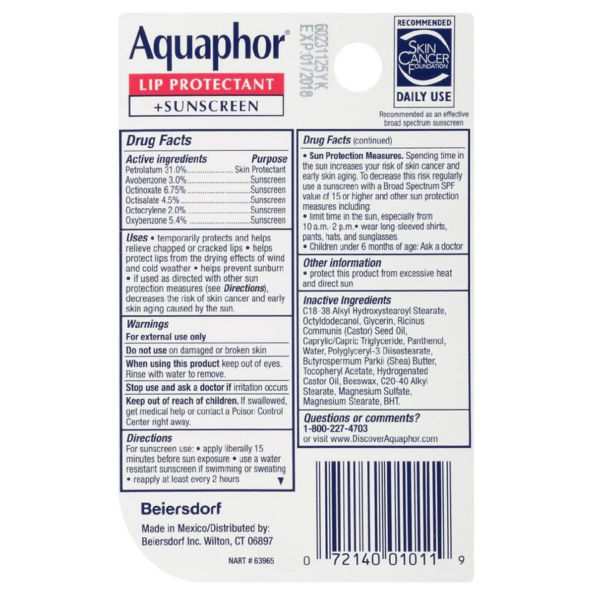 Aquaphor Lip Protectant + Sunscreen broad spectrum SPF 30 lip balm immediately relieves dryness and helps protect your lips against UVA and UVB rays. The unique formula relieves and soothes chapped, cracked lips and provides effective, long-lasting moisture, so lips look and feel healthier.