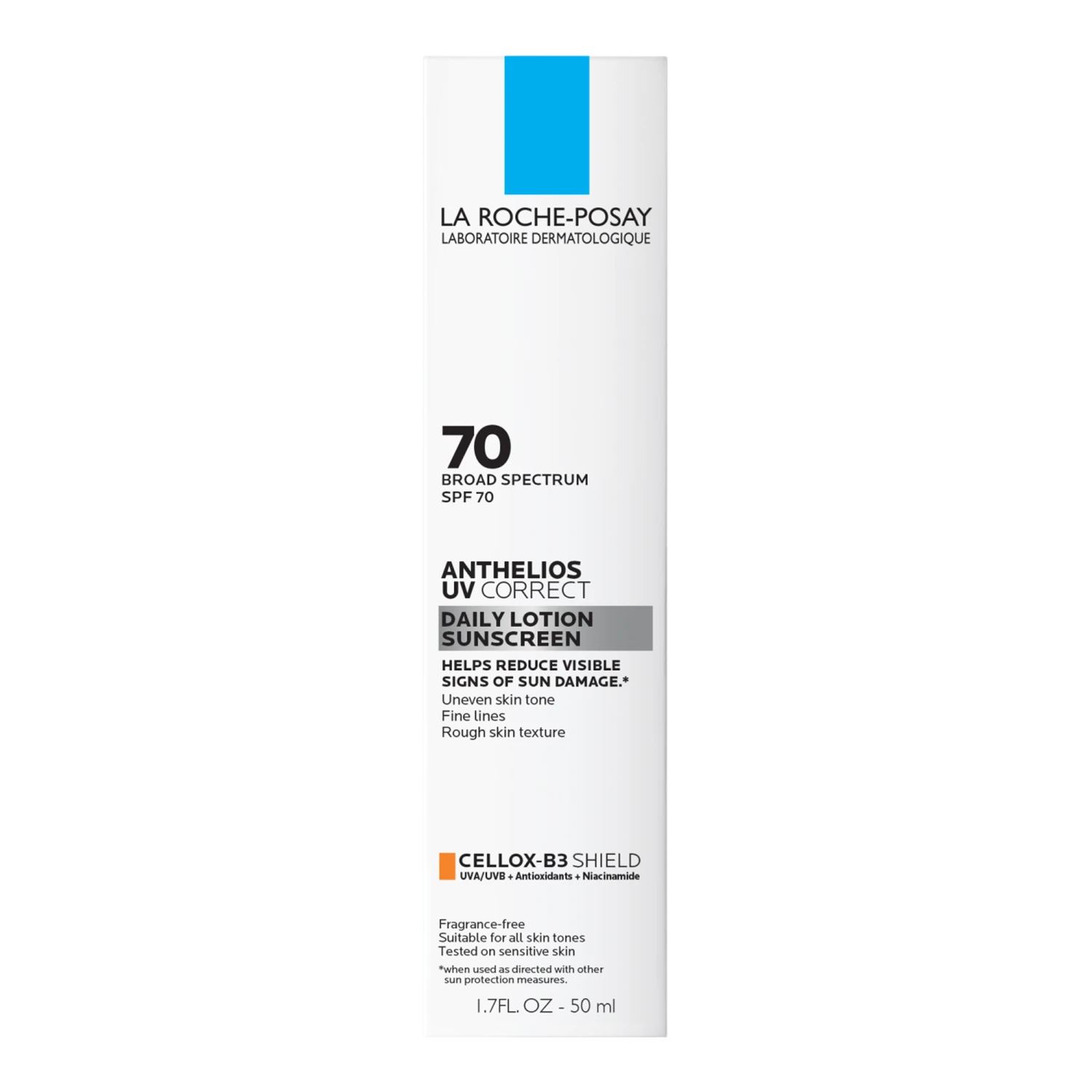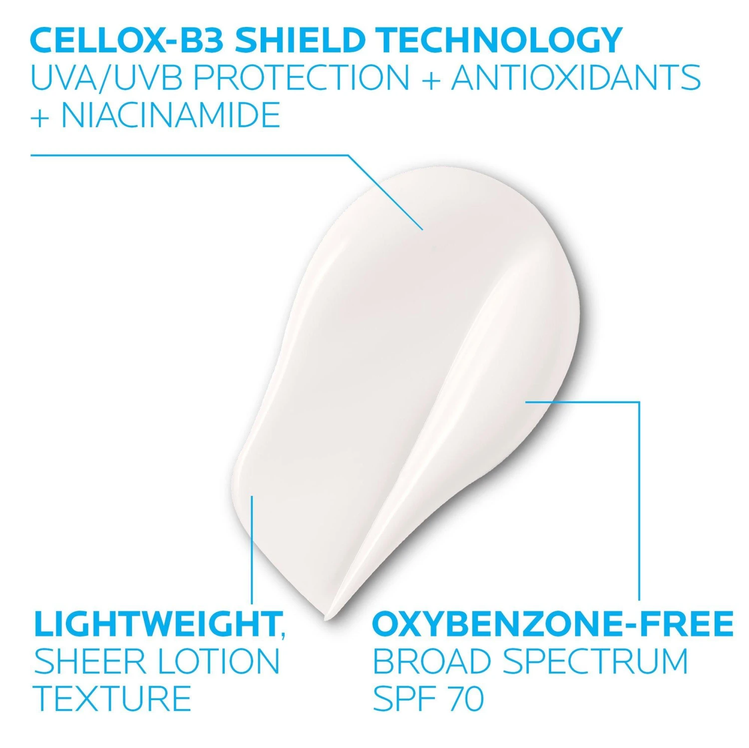 #### Benefits – Formulated with niacinamide to help visibly fade discoloration – Non-whitening, lightweight sheer finish lotion texture blends easily into all skin tones – A powerful antioxidant complex helps protect skin from free radicals caused by UV rays – Formulated and rigorously tested for skin tolerance, even on sensitive skin – Allergy tested – Sensitive Skin Tested – Non-comedogenic – Dermatologist Tested for Safety #### Key Ingredients – Cellox-B3 Shield® Technology: broad spectrum UVA/UVB protection with antioxidants & niacinamide Niacinamide helps visibly fade skin discoloration – Niacinamide helps visibly fade skin discoloration – Senna Alata, a tropical leaf extract known to defend the skin against damaging free radicals caused by the sun that can accelerate skin aging – La Roche-Posay Thermal Spring Water is naturally rich in minerals with scientifically demonstrated soothing and antioxidant properties #### Formulated Without – Oil – Parabens – Fragrance – Oxybenzone – Octinoxate
