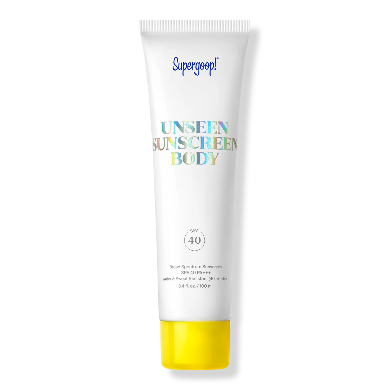 #### Benefits – The body version of our bestselling Unseen Sunscreen! – Silky, nourishing, more glide-able gel formula – Moisturizing & fast-absorbing – Optimized for your body’s unique skincare needs to help retain moisture on skin prone to dryness #### Key Ingredients – Olive Leaf & Fruit Extracts: Help retain moisture, soothe skin & reinforce your skin’s natural barrier – A Plant-Derived Emollient: Delivers moisture to your skin without any greasy after-feel – Fluid Elastomers: Wrap the skin in an ultrasoft, weightless layer of protection #### Formulated Without – At Supergoop!, they thoughtfully choose ingredients based on global regulations and the latest scientific research. Their “No List” includes 1600+ ingredients that they never add in their products, including oxybenzone, octinoxate, parabens, phthalates, sulfates and synthetic fragrances.